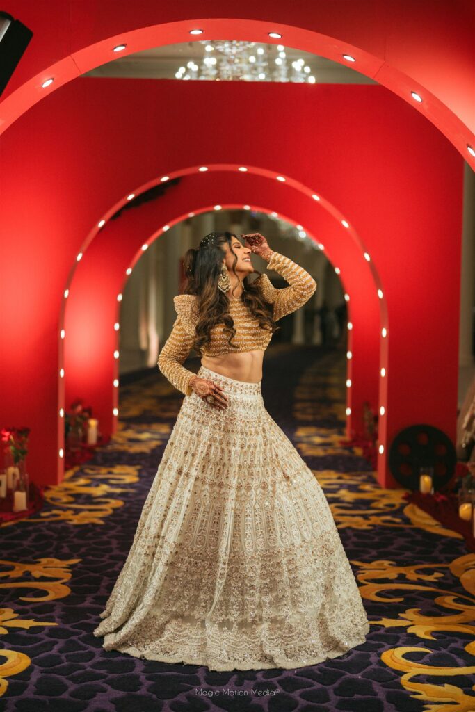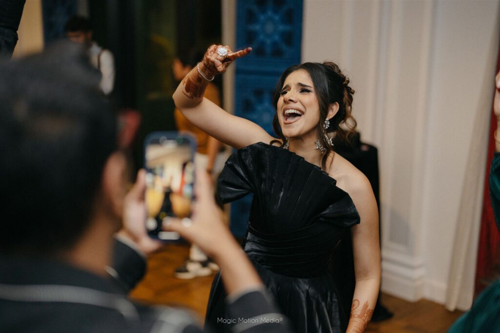 Our Sangeet felt like we had stepped straight into a Bollywood film. The ballroom was transformed with dramatic black and red tones, and the space carried a glamorous cinematic atmosphere. The highlight of the décor was the set of life-size Bollywood-style posters of us and our guests and we absolutely loved taking pictures with them.