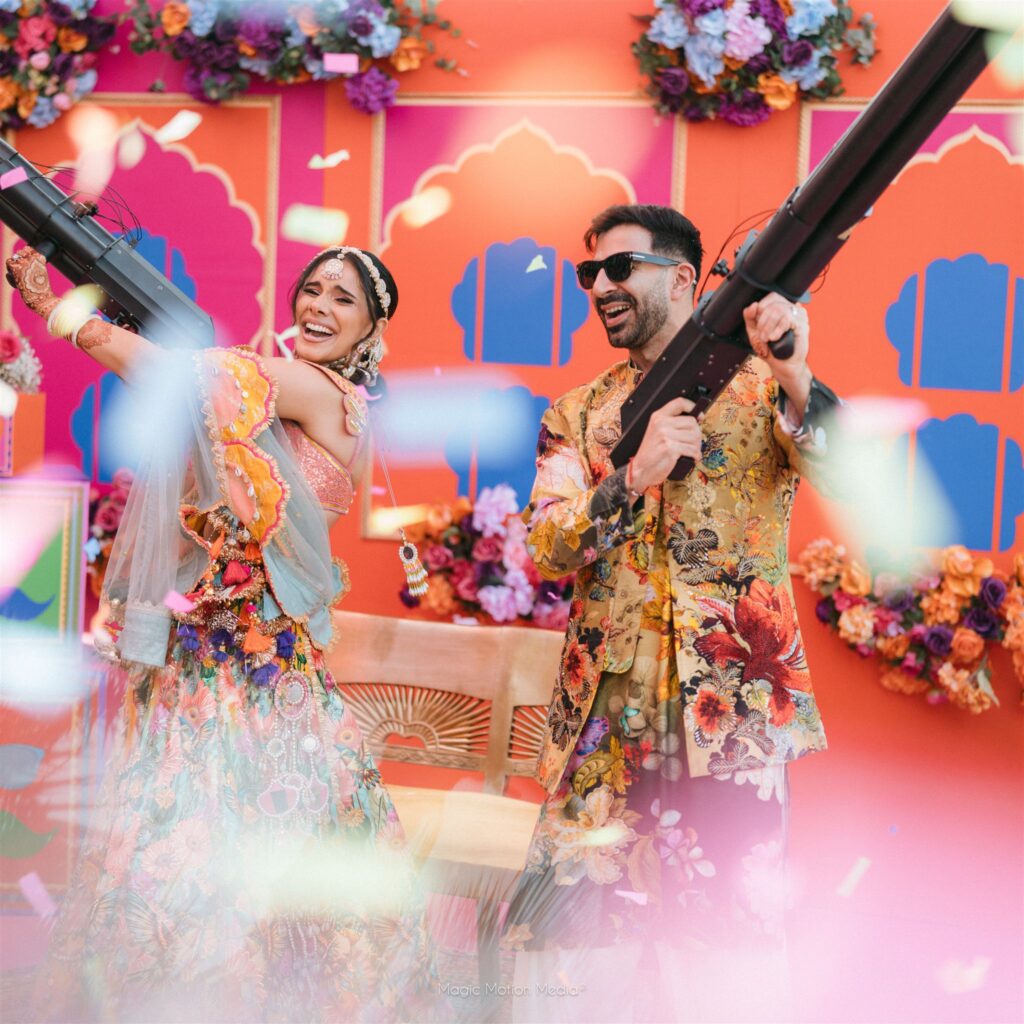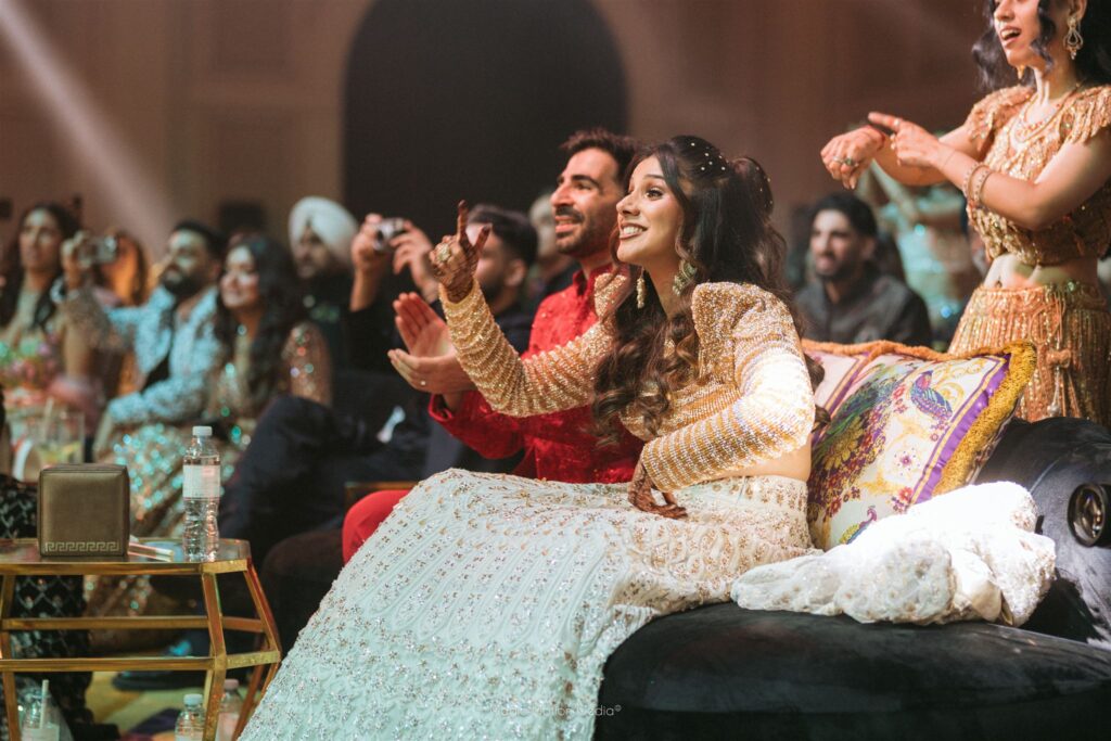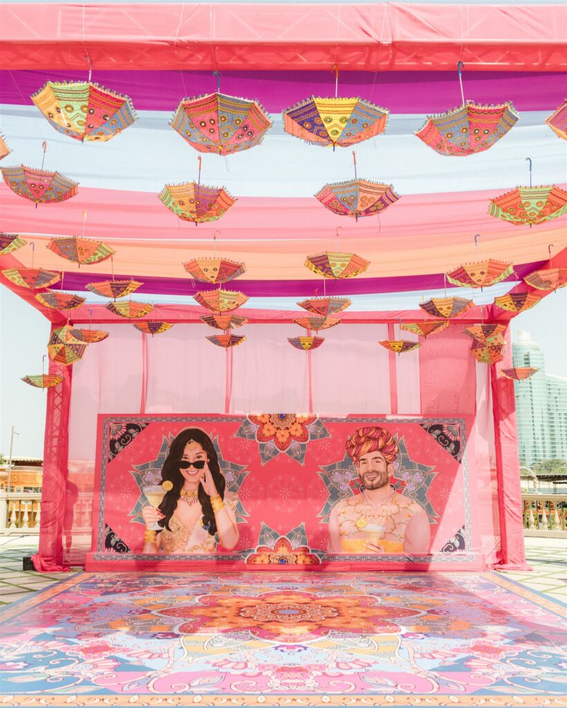Our Mehendi was pure happiness. We wanted a full carnival experience, and Ikigaii brought that vision to life in the most colourful way. The décor had strong pink tones and the entire space was filled with stalls, a chudi wala, mehendi artists, jugglers, stilt walkers, and even two salsa dancers in costume. Our stage backdrop had hand-drawn sketches of both of us, and the dance floor was filled with bright designs.