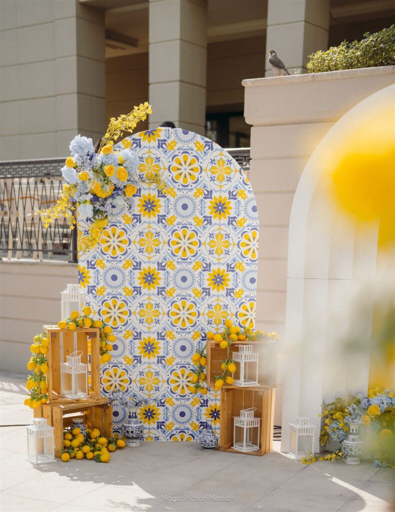We began our celebrations with a bright Amalfi-inspired haldi pool party. The colours were fresh and joyful with shades of yellow and blue everywhere. The energy felt warm and happy, and the décor created the perfect sunny atmosphere for the start of our wedding.
